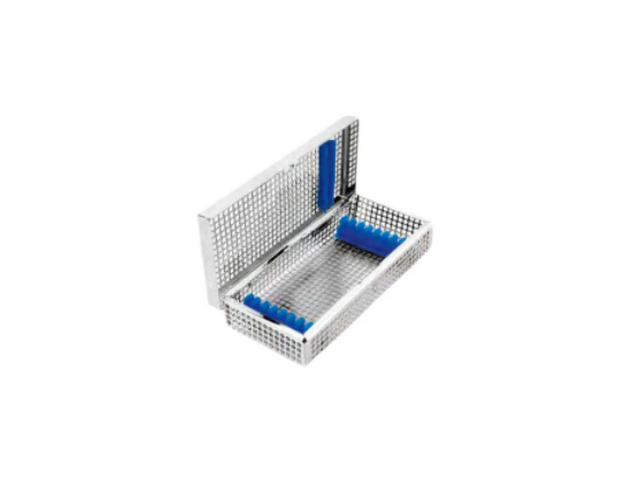 The Basket with Silicone Fixation Systems is designed to securely hold up to 8 instruments with a 5 mm diameter during sterilization, storage, and transport. Measuring 188 × 86 × 36 mm, this basket features a silicone fixation system that prevents instruments from moving, scratching, or colliding, ensuring maximum protection for delicate surgical or dental tools. Ideal for use in CSSD, operating rooms, and dental clinics.